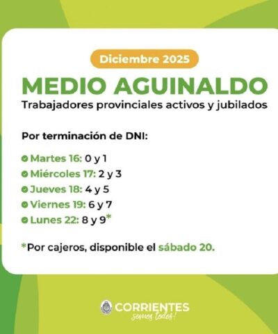 El Gobierno de Corrientes oficializó el cronograma de pago del medio aguinaldo correspondiente a diciembre de 2025 para empleados estatales activos y jubilados. El esquema se realizará por terminación del DNI y se extenderá del martes 16 al lunes 22.