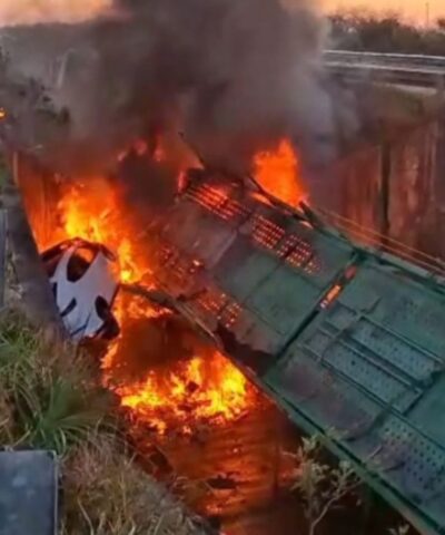 Un camión de los denominados “mosquito” que transportaba autos 0 kilómetro cayó de un puente y se prendió fuego en el kilómetro 414 de la autovía 14,en proximidades de Parada Pucheta dejando como saldo el fallecimiento del chofer del vehículo.